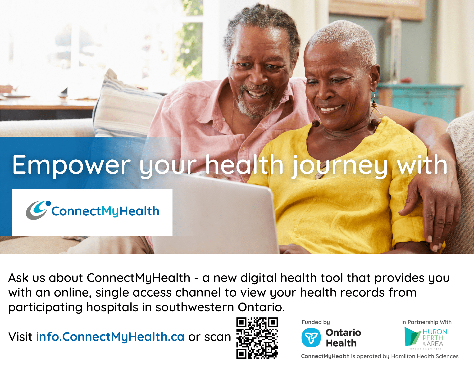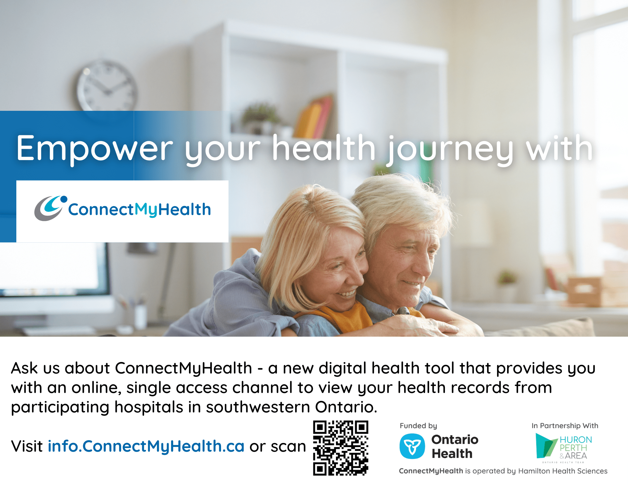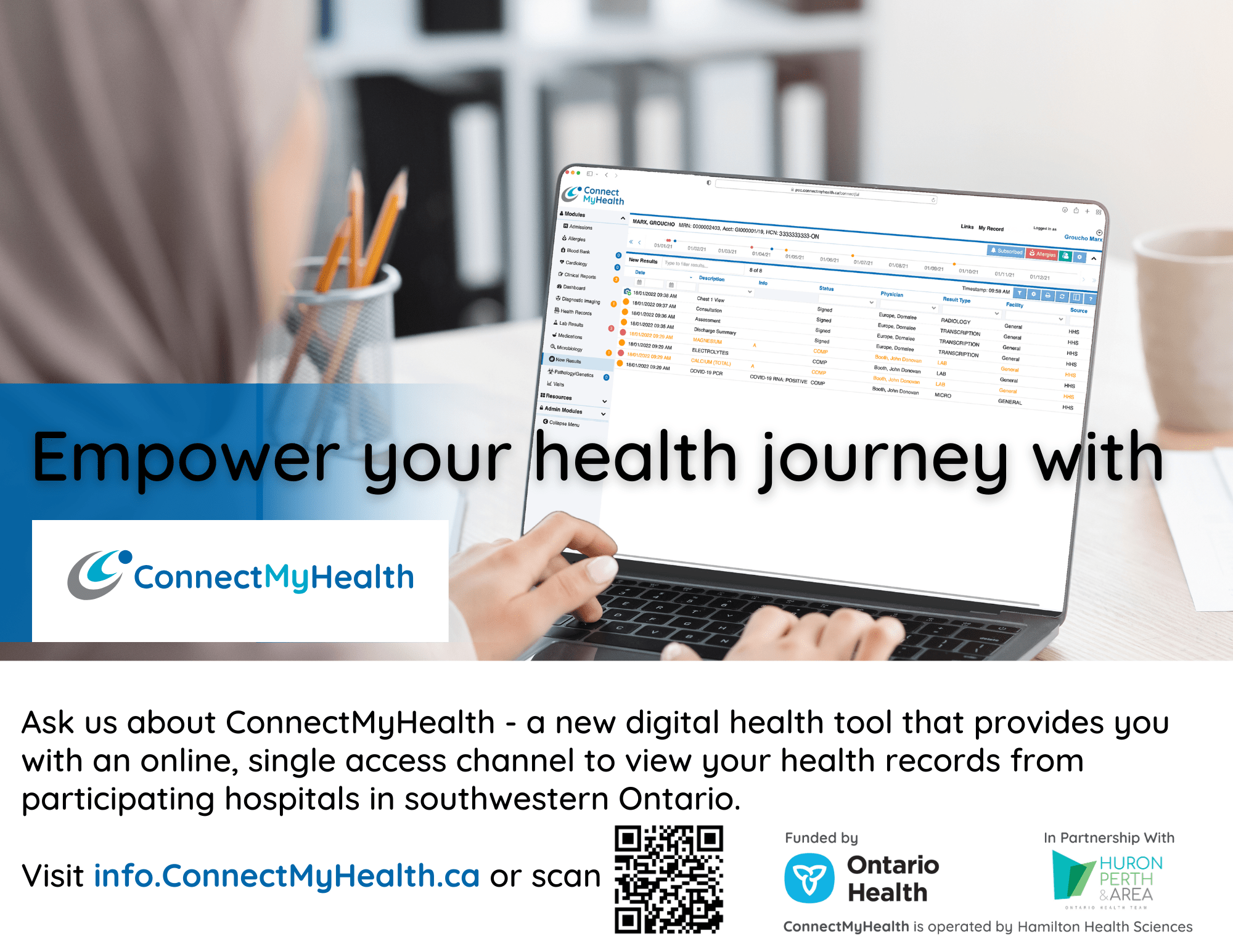 Patients in Huron and Perth are benefitting from using ConnectMyHealth to access their health records from participating hospitals in southwest Ontario. Visit https://info.connectmyhealth.ca/register to learn more and register for your account.