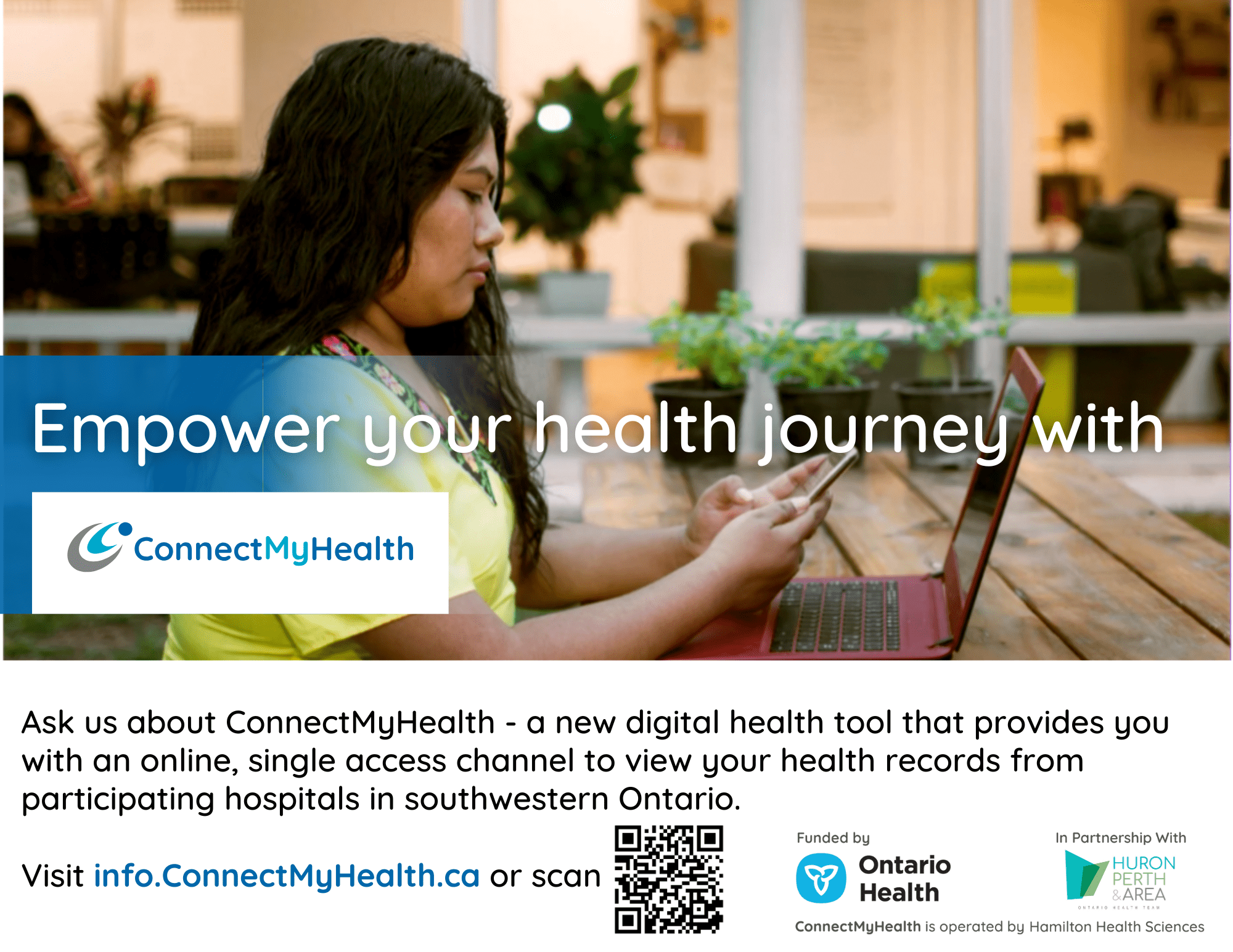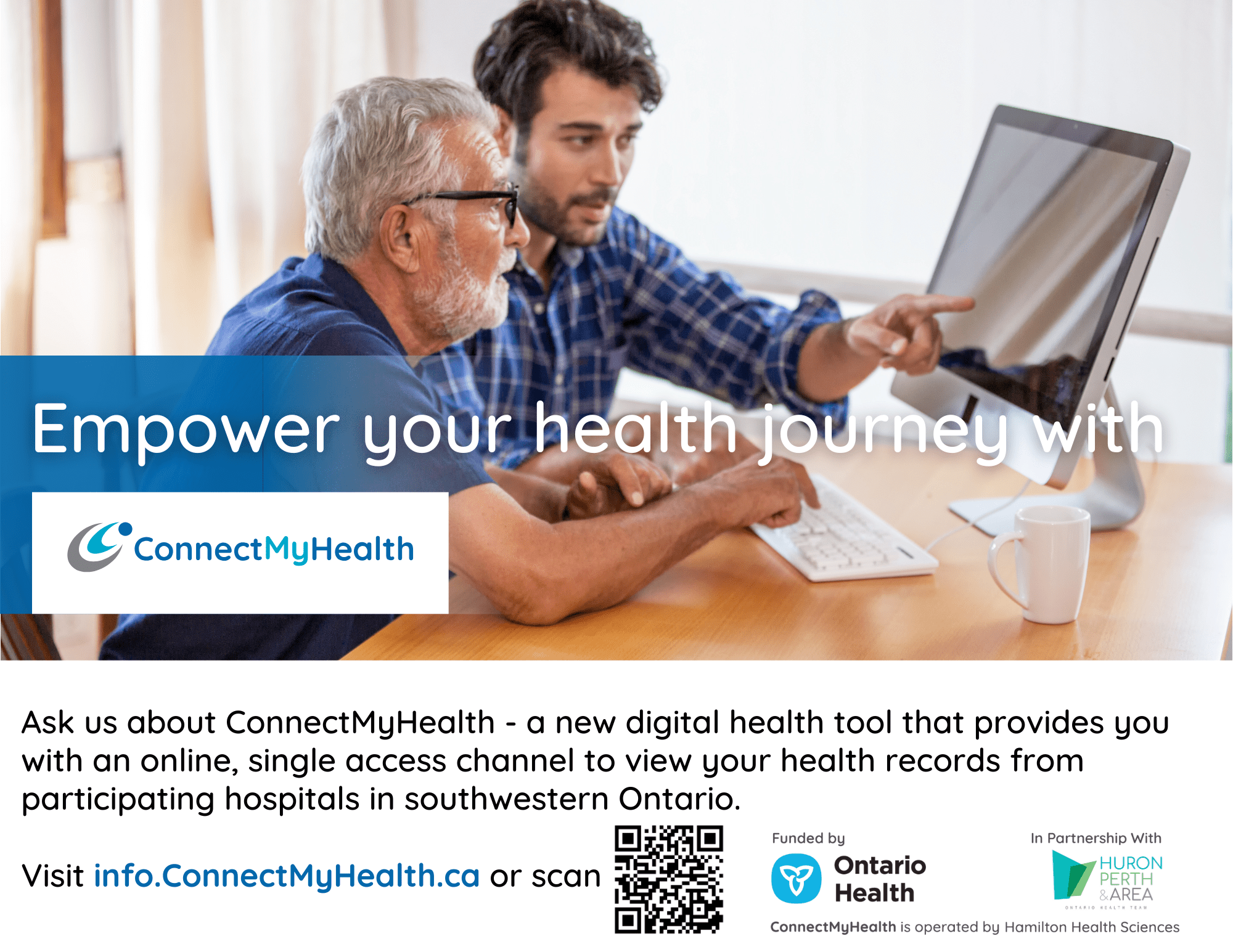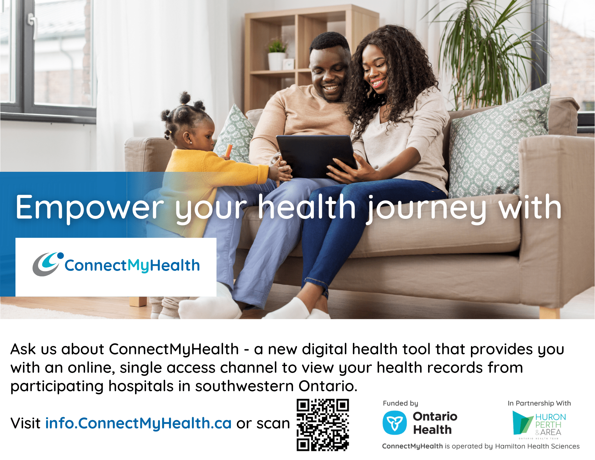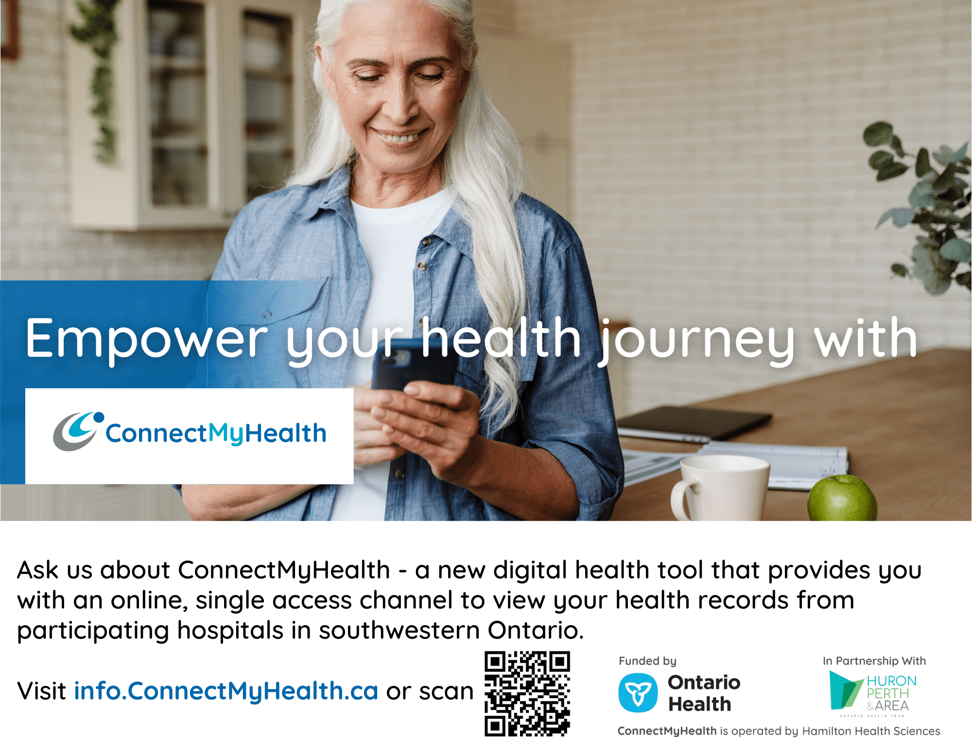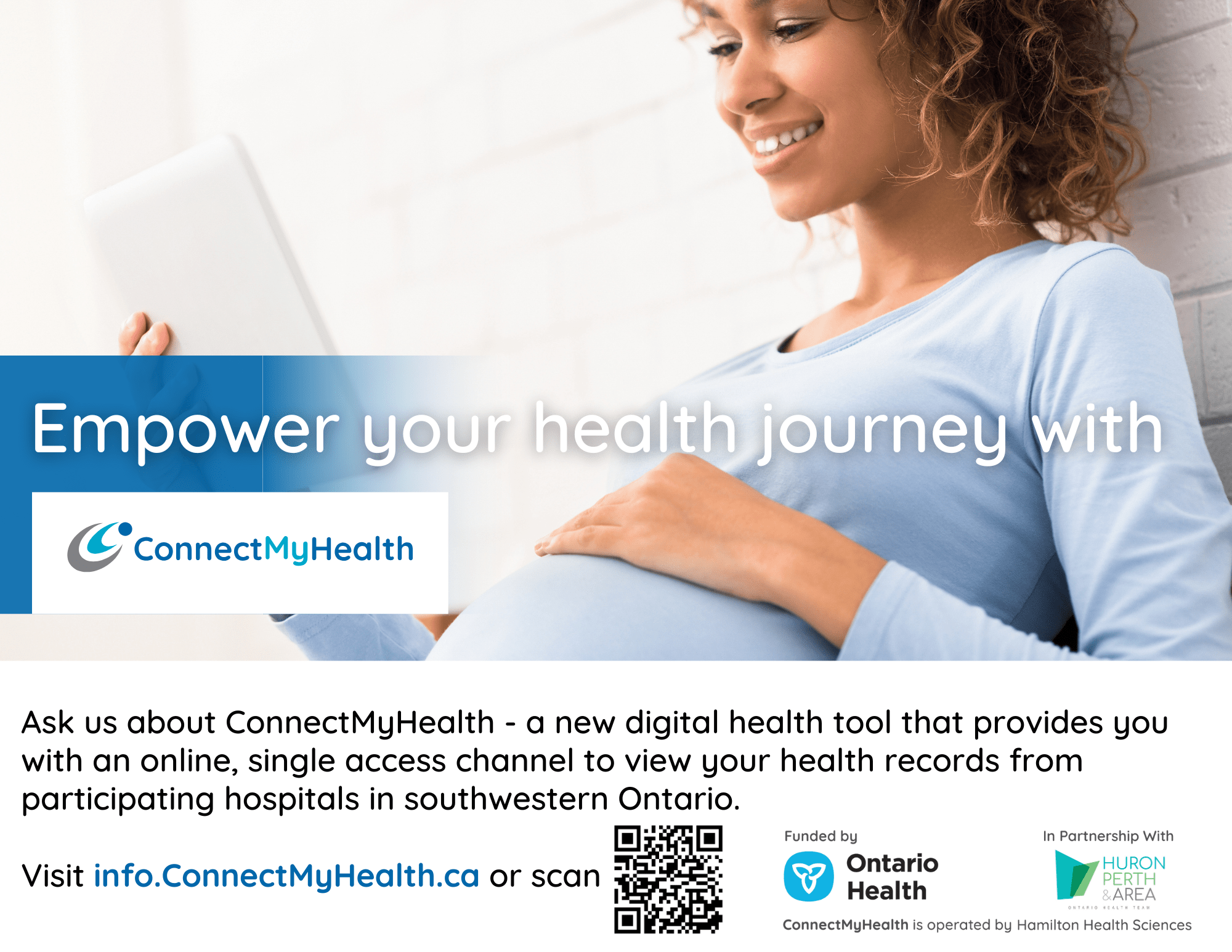 To support the promotion of ConnectMyHealth, a digital health tool that provides patients with a free, online, single access point to view their health records from participating hospitals in southwestern Ontario, the Huron Perth & Area Ontario Health Team (HPA-OHT) has developed a suite of ready-to-use promotional resources for organizations.